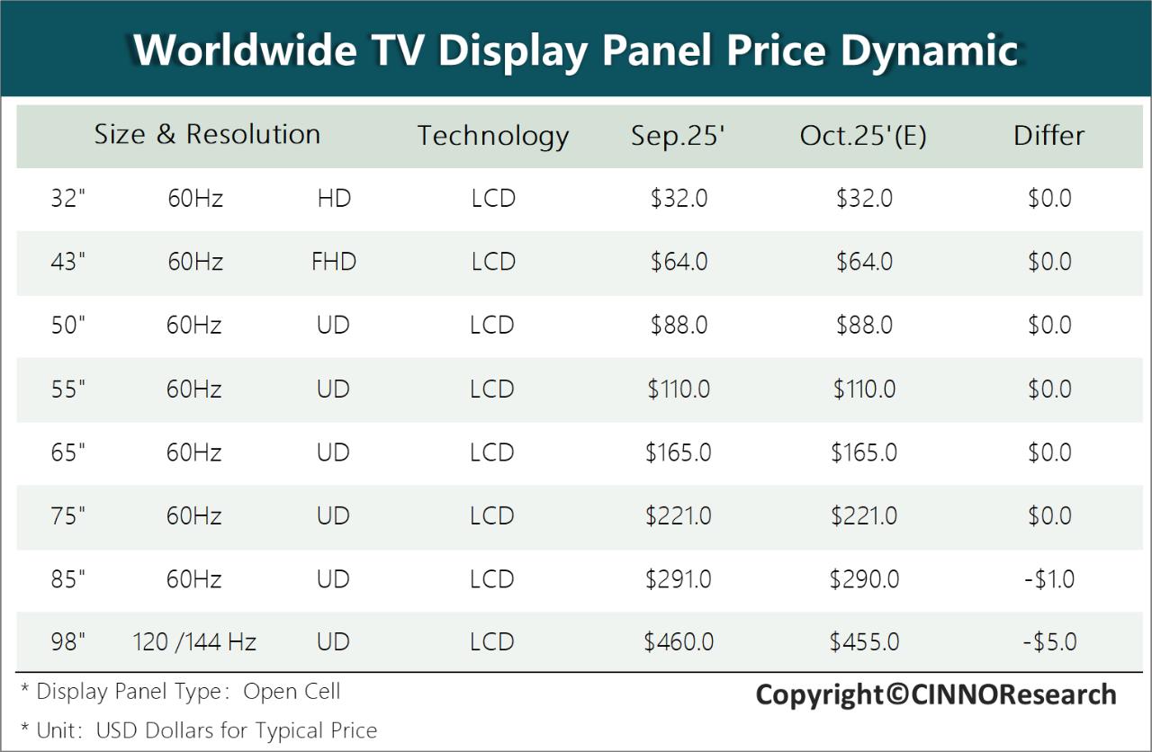 今年三季度,品牌商为应对年终旺季而进行的集中备货,使得面板需求维持高位,与此同时,面板厂相应提高产线稼动率以配合订单交付,推动LCD TV主流面板价格在9月全线接近止跌。进入四季度,品牌端备货进入尾声,部分厂商也开始陆续调节库存,LCD TV面板需求预计将开始放缓,为应对此转变,面板厂在“十一”假期期间主动下修稼动率,通过调控供给以平衡市场来稳定价格,预计10月面板价格维持全面持平态势。