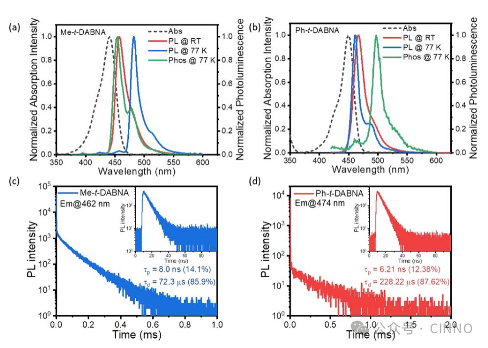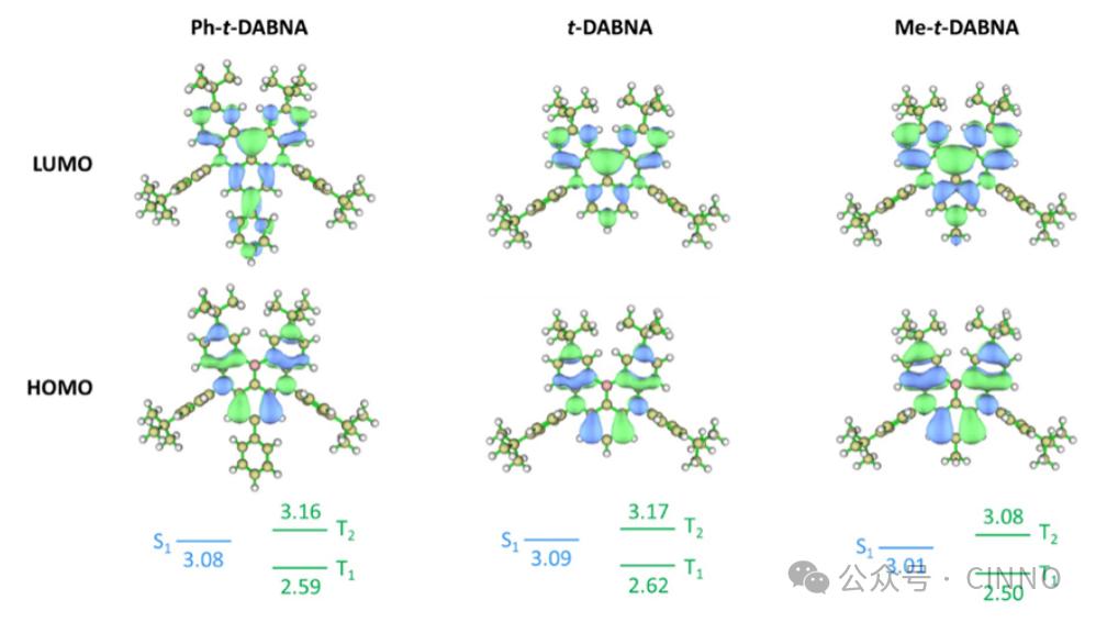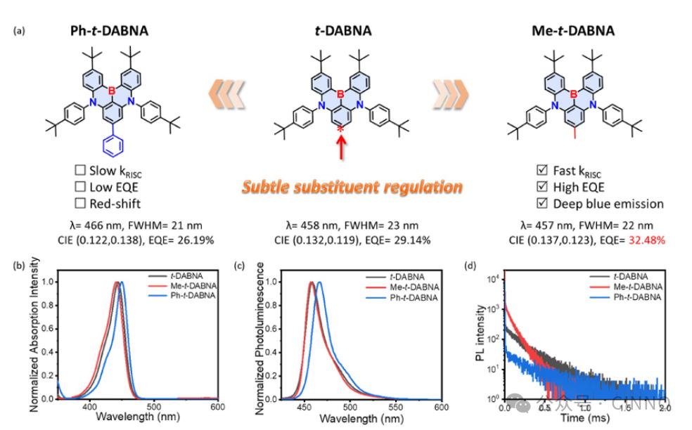 为破解这一难题,该研究团队摒弃了传统的 “大结构改造” 思路,聚焦 “细微取代基调控”—— 在t-DABNA分子中与硼原子直接相连的中心苯环对位(即硼原子对位碳),分别引入甲基(Me)和苯基(Ph)两种基团,设计合成Me-t-DABNA与Ph-t-DABNA两种衍生物,并通过系统的光物理测试与理论计算,验证取代基对材料性能的调控机制。