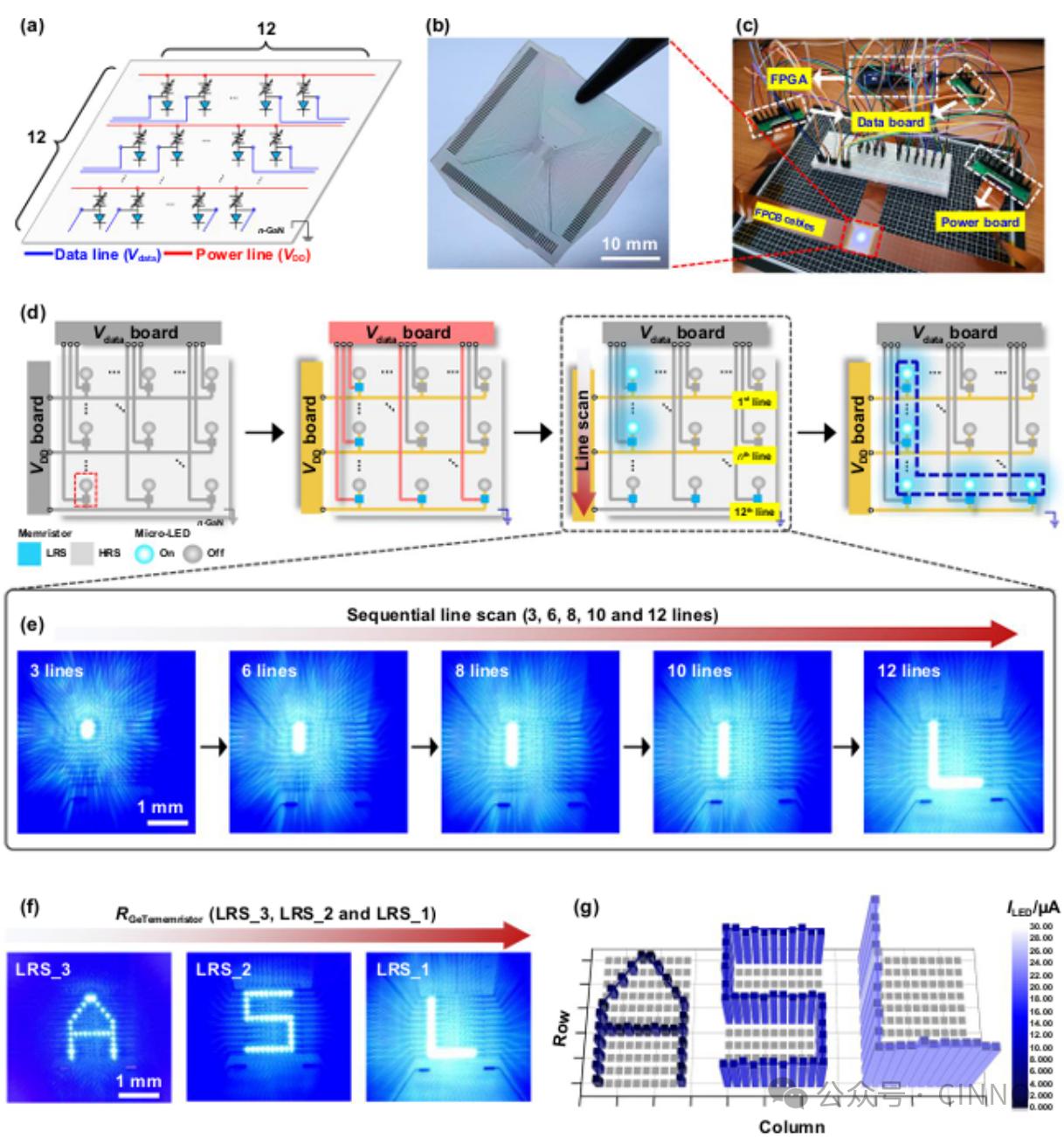 该12×12阵列采用 “横向电源线 + 纵向数据线” 的交叉设计,其中电源线(VDD)贯穿每行像素,提供工作电压;数据线(Vdata)则连接每个单元像素中GeTe忆阻器的底部电极,负责施加SET/RESET电压以调控忆阻器的电阻态。这种设计的核心优势在于 “无串扰”—— 通过控制特定行的电源线与特定列的数据线电压差,可精准选中单个像素,避免相邻像素的误触发。例如,当需要点亮某一像素时,仅需对对应数据线施加2.4V电压,电源线施加2.7V 电压,形成0.3V的SET电压差,即可使忆阻器从高阻态切换至低阻态,驱动Micro-LED发光。