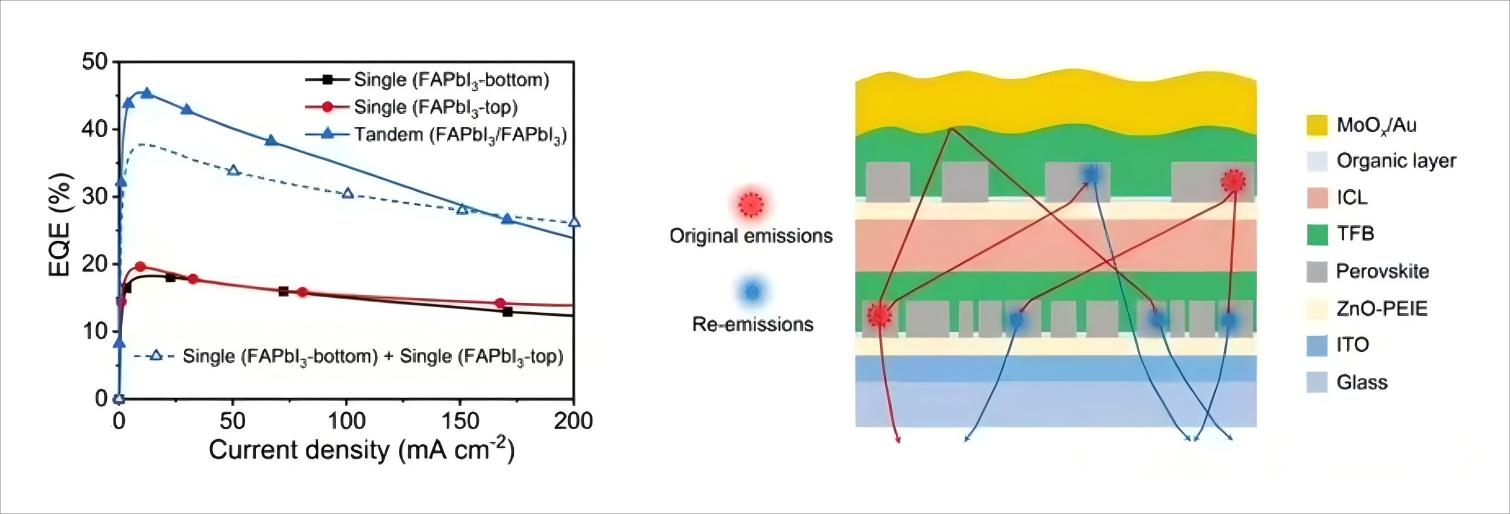 更为重要的是,团队还通过调控钙钛矿发光层的微纳结构,创新性地提出利用叠层器件中独特的层间光子循环效应的策略,即一个发光单元产生的光子可被另一钙钛矿层重新吸收并再次发射,从而突破了传统光提取效率的限制。