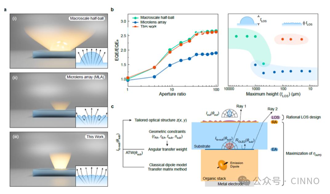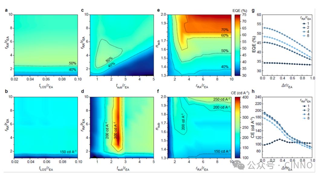 更令人振奋的是,当rRA/rEA提升至3时,器件的性能进一步提升,EQE达到了57.2%,CE则高达217 cd/A,这一性能水平已接近宏观半球透镜(EQE约43.75%、CE约400.5 cd/A),但在平面性和集成性方面,LP30-LOS远超宏观半球透镜,能够更好地满足各类显示产品的需求 。