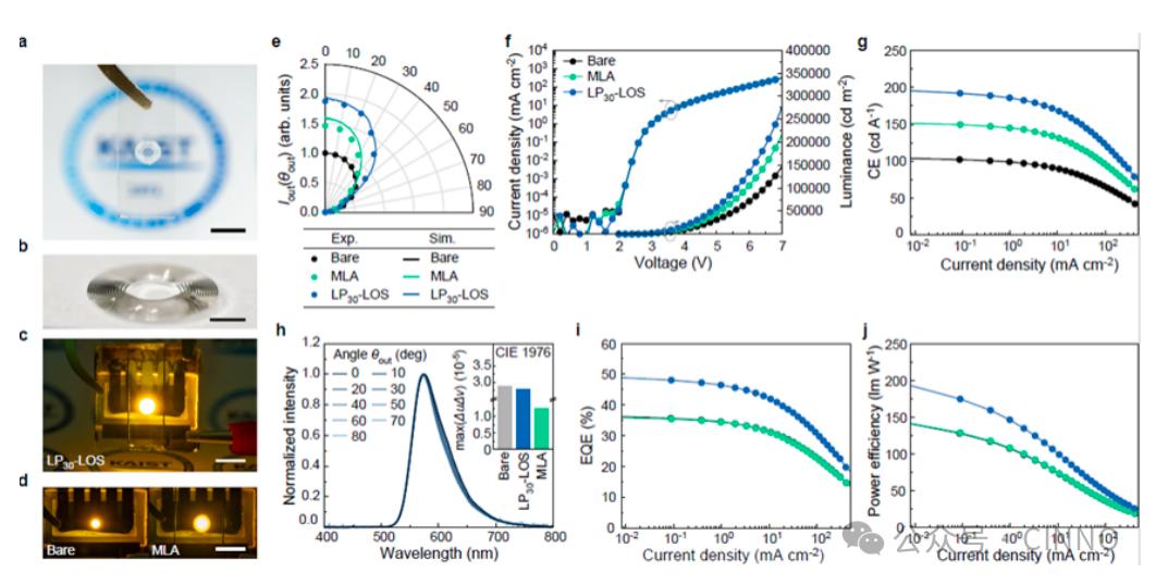 为了全面验证新型近平面出光结构的性能,KAIST团队进行了大量的实验测试,结果表明,搭载LP30-LOS的OLED器件在各项关键性能指标上均实现了对传统方案的全面超越。