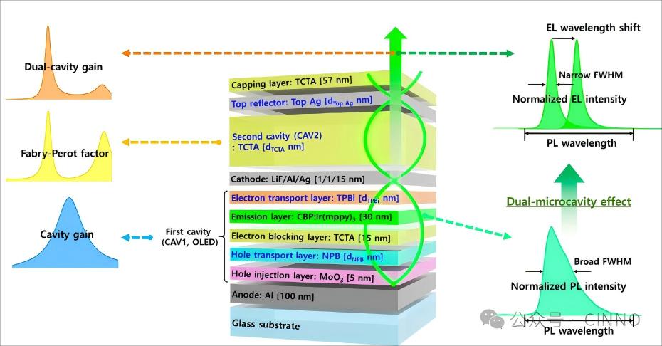 针对传统技术的痛点,韩国联合研究团队跳出“材料创新” 的固有思维,转而从器件结构设计入手,提出 “双微腔共振增强珀塞尔效应” 的全新策略。通过在单微腔顶发射 OLED(G-SMTOLED)上方引入次级光学腔(CAV2),构建 “底层发光微腔 + 上层调控微腔” 的嵌套结构,成功实现光学与电学设计的分离优化,从根本上解决了光谱窄化与器件性能之间的矛盾,其核心创新体现在三个维度。
