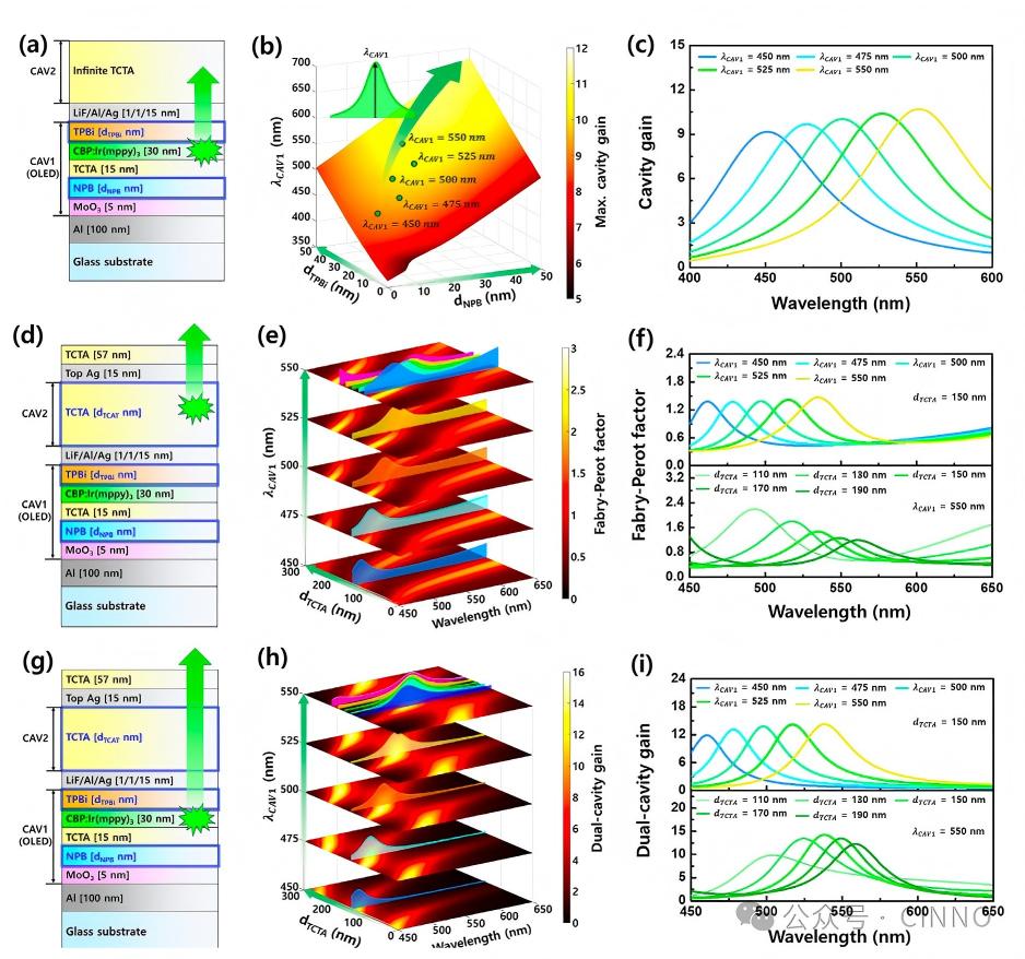 图2. a)为器件结构示意图;b)为腔体增益的三维分布图;c)为 OLED 腔体增益随 NPB 层厚度与 TPBi 层厚度的变化曲线;d)为附加腔体结构示意图;e)为法布里 - 珀罗因子的三维切片图,f)为 G-DMTOLEDs 中CAV2 的法布里 - 珀罗因子随CAV1波长与 TCTA 层厚度的变化曲线;g)为完整 G-DMTOLEDs 器件的结构示意图;h)为双腔总增益的三维切片图;i)为器件双腔总增益随CAV1波长与TCTA 层厚度的变化曲线