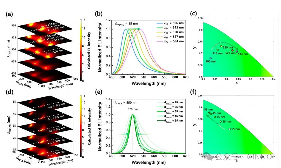 此外,调节顶部银层厚度可进一步优化光谱特性。当 d_Top Ag 从 15 纳米增至 55 纳米时,EL 光谱的 FWHM 持续窄化,最窄可达 13.6 纳米,对应的 CIE 1931 色坐标从(0.212, 0.707)偏移至(0.126, 0.777),颜色纯度大幅提升。这种多维度的调控方式,使器件能够根据不同应用场景的需求,精准匹配目标波长,为全色系超纯发射器件的开发提供了通用方案,具备极强的技术扩展性。