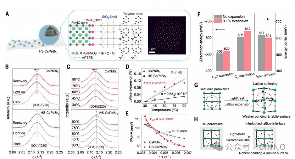 界面稳定作用:DFT计算表明,仅0.1%的晶格膨胀就会显著增强H₂O和O₂分子在钙钛矿表面的吸附能力,并降低Br⁻离子的迁移势垒,加速表面水解和氧化反应;层级壳通过抑制晶格膨胀,从源头阻断了这一连锁反应;