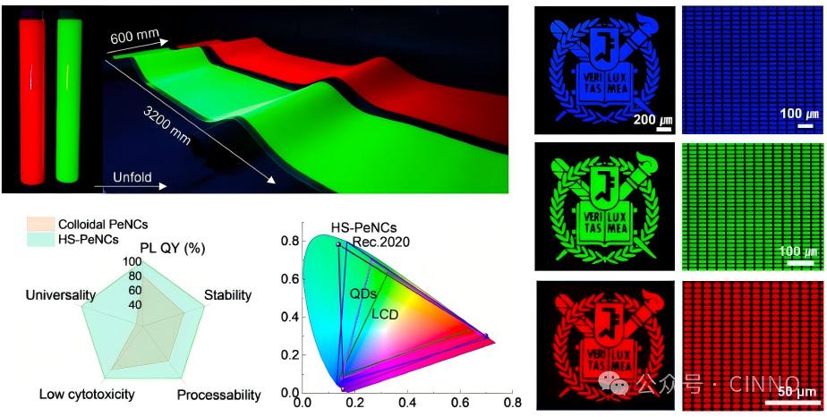 全无机体系:HS-CsPbCl₃、HS-CsPbBr₃等全无机钙钛矿均实现了近100%量子产率和长期稳定性,拓展了高稳定性场景的应用可能。