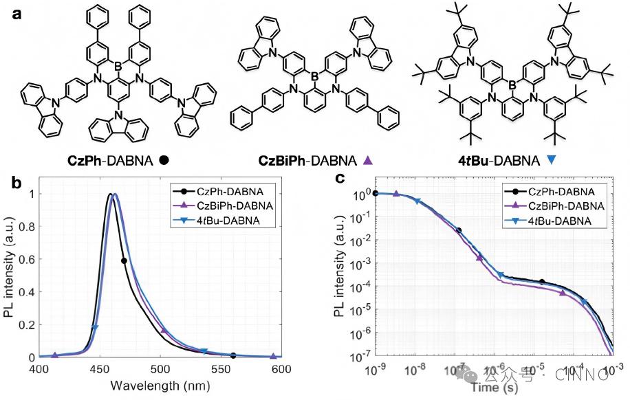 图1. a) 三种多共振热激活延迟荧光发射器的化学结构:CzPh-DABNA、CzBiPh-DABNA 和 4tBu-DABNA;b) 稳态光致发光光谱;c) 这些发射器掺杂在共主体基质中、于293 K 下测得的瞬态光致发光衰减曲线