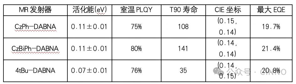 团队精心挑选了三种结构相似但电子特性存在细微差异的深蓝光 MR 发射器 ——CzPh-DABNA、CzBiPh-DABNA 和 4tBu-DABNA,在保持磷光敏化剂(PtON-TBBI)、共主体基质(SiCzCz/SiTrzCz2=60:40)及器件结构完全一致的前提下,系统对比了它们的性能表现: