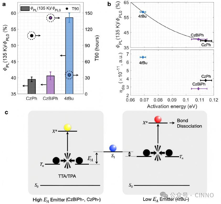 高活化能意味着中间三线态的能量更低,这会带来两个关键影响:一是减少三线态 - 三线态湮灭(TTA)、三线态 - 极化子湮灭(TPA)等过程产生的高能激发态;二是降低高能激发态对MR发射器化学键的冲击,从而抑制分子解离 —— 这正是 PSF OLED 降解的主要路径。