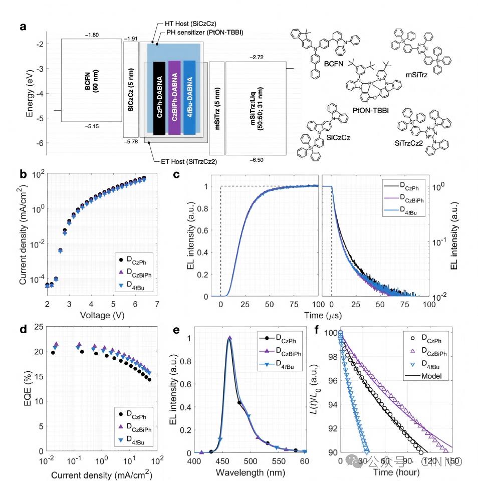 图 5. a)磷光敏化荧光有机发光二极管的器件结构及所用材料的化学结构;b) 电流密度-电压特性曲线;c) 瞬态电致发光曲线;d) 外量子效率-电流密度特性曲线;e) 1000 cd/m² 亮度下的电致发光光谱;f) DCzPh、DCzBiPh和D4tBu三种器件在1000 cd/m²初始亮度、恒流驱动条件下的亮度随时间衰减曲线