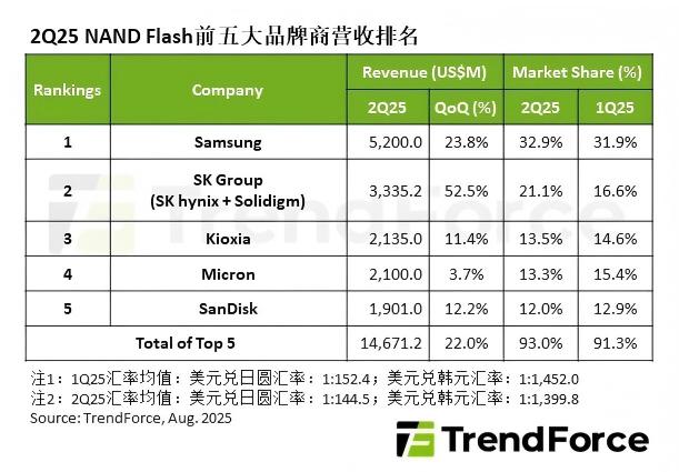 SK Group (SK集团,含SK海力士和Solidigm)第二季受惠于Solidigm Enterprise SSD出货暴增,以及SK海力士321层NAND Flash量产导入,营收攀升至近33.4亿美元的新高纪录,环比增长52.5%,排名第二,市占率更从前一季的16.6%成长至21.1%,也是集团历史新高。