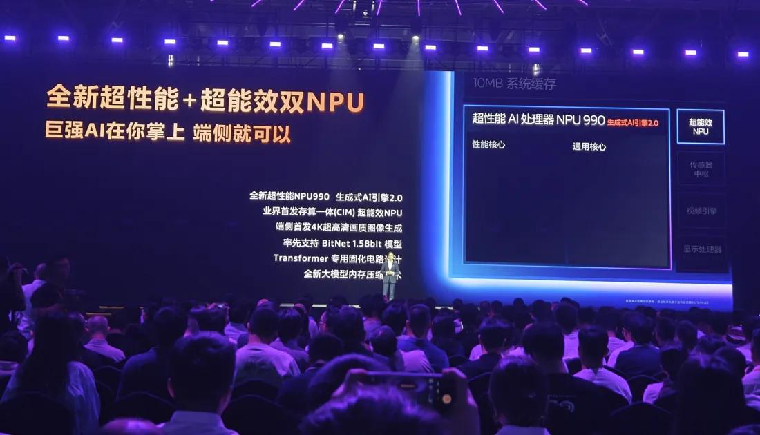 其中,NPU990的超性能NPU为超强端侧 AI 体验而生,峰值性能相较上一代提升 111%,在大语言模型摘要输出能力、多模态理解能力皆有大幅跃进,并率先实现4K高清画质文生图。