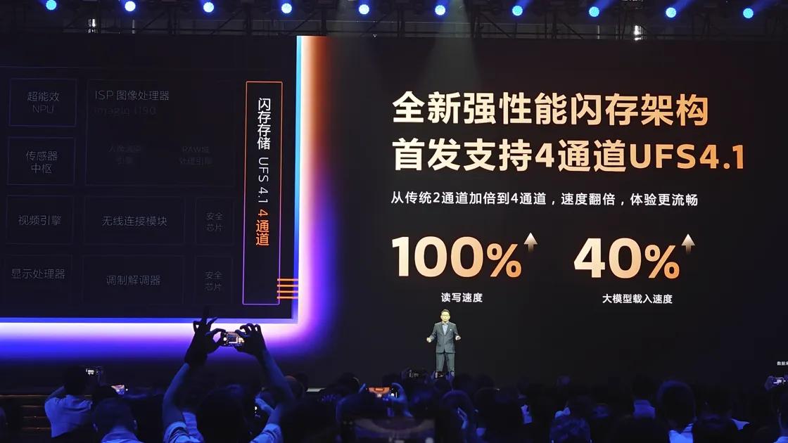 借助天玑9500超强的计算能力,联发科也首发支持4通道UFS4.1存储,在读写速率上提升了100%,这也使得天玑9500在端侧大模型的加载速度上提升了40%。