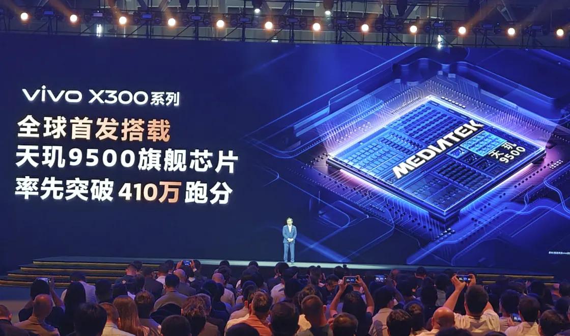 在此次发布上,vivo高管也上台讲述了与联发科的合作,并宣布vivo X300系列将全球首发搭载天玑9500旗舰芯片,同时还透露了其安兔兔跑分突破了410万分。