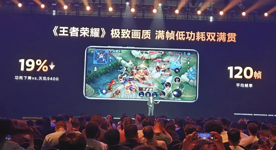 比如,在《王者荣耀》游戏中,天玑9500在连续30分钟120帧满帧运行的情况下,功耗相比上一代天玑9400还降低了19%。这是一个非常大的改进,可以让用户可以玩的更久更舒服。