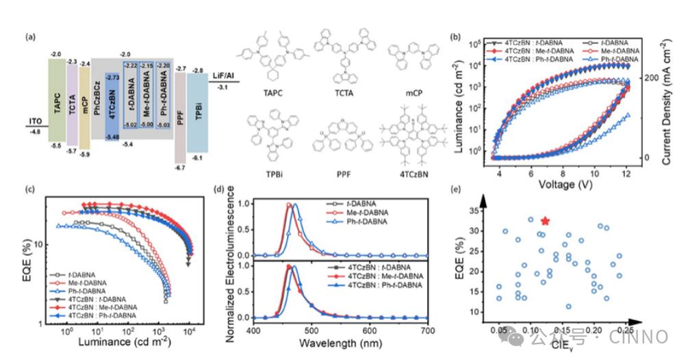 敏化器件测试结果显示,Me-t-DABNA基器件的最大EQE达到32.48%,较对比基础器件(25.55%)提升27%,较 t-DABNA敏化器件(29.15%)提升11%;同时,该OLED器件保持 461nm的发射峰值、30nm的FWHM和 (0.137, 0.123) 的CIE坐标,色纯度未因效率提升而受损。相比之下,Ph-t-DABNA敏化器件的EQE仅为26.19%,且发射波长红移至470nm,无法满足纯蓝需求。