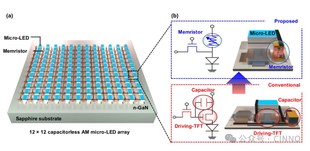 在显示技术向 “超高清、低功耗、微型化” 迈进的关键阶段,一项来自韩国科研团队的突破性成果引发行业高度关注。近日,高丽大学、三星显示与印度希瓦吉大学等机构联合在《极端制造》期刊上发表研究论文,提出一种基于碲化锗(GeTe)忆阻器的无电容AM Micro-LED显示架构。该技术通过单片集成亚伏级忆阻器驱动像素,不仅成功替代传统晶体管 - 电容组合,更实现了48.1%的功耗降低、93.1%的超高开口率,以及6000PPI以上的像素密度潜力,为AR/VR、智能穿戴、医疗影像等高端显示场景提供了全新解决方案。