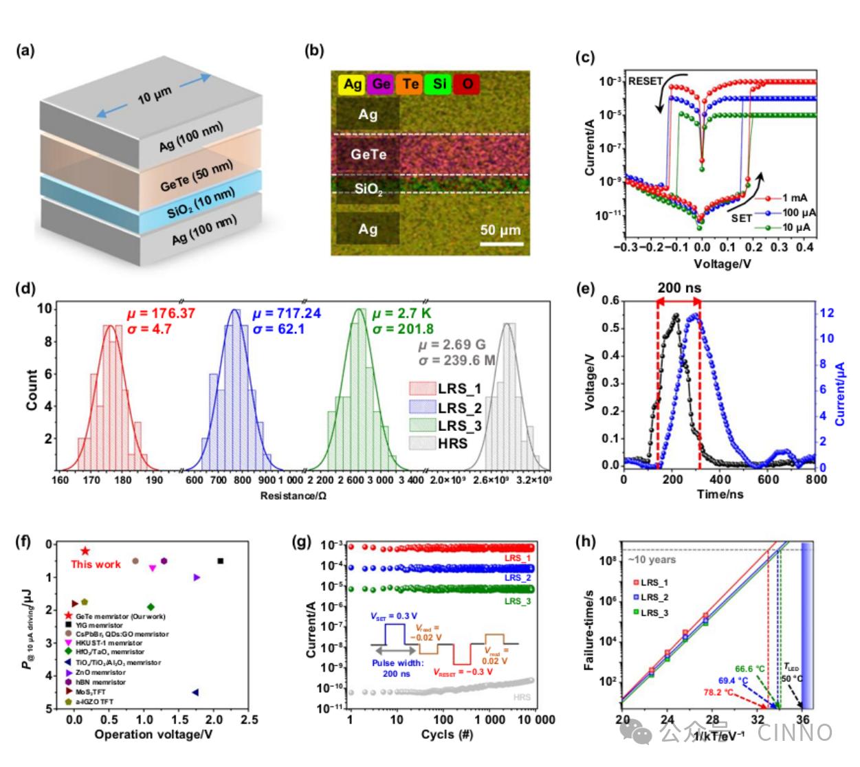 GeTe忆阻器最显著的优势在于其极低的工作电压与优异的电流调控能力。测试数据显示,该忆阻器的SET电压(从高阻态切换至低阻态的电压)仅为0.17V,RESET电压(从低阻态切换至高阻态的电压)为- 0.15V,远低于传统IGZO TFT晶体管1.5-3V的阈值电压。在驱动10μA Micro-LED工作电流时,GeTe忆阻器的功耗仅为10nJ,而传统IGZO TFT的功耗则高达60-120000nJ,差距最高可达1.2万倍。