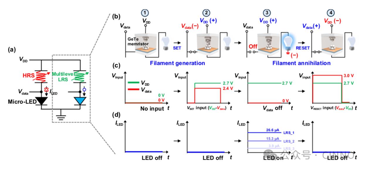 面对传统架构的固有缺陷,上述韩国联合研究团队创新性地提出 “以忆阻器替代晶体管 + 电容” 的核心思路,选择GeTe(碲化锗)作为忆阻器核心材料,凭借其独特的 “电阻态可控性” 与 “电荷保持能力”,成功实现了单元件对传统架构中两个核心元件的功能替代,从根本上重构了Micro LED的驱动逻辑。