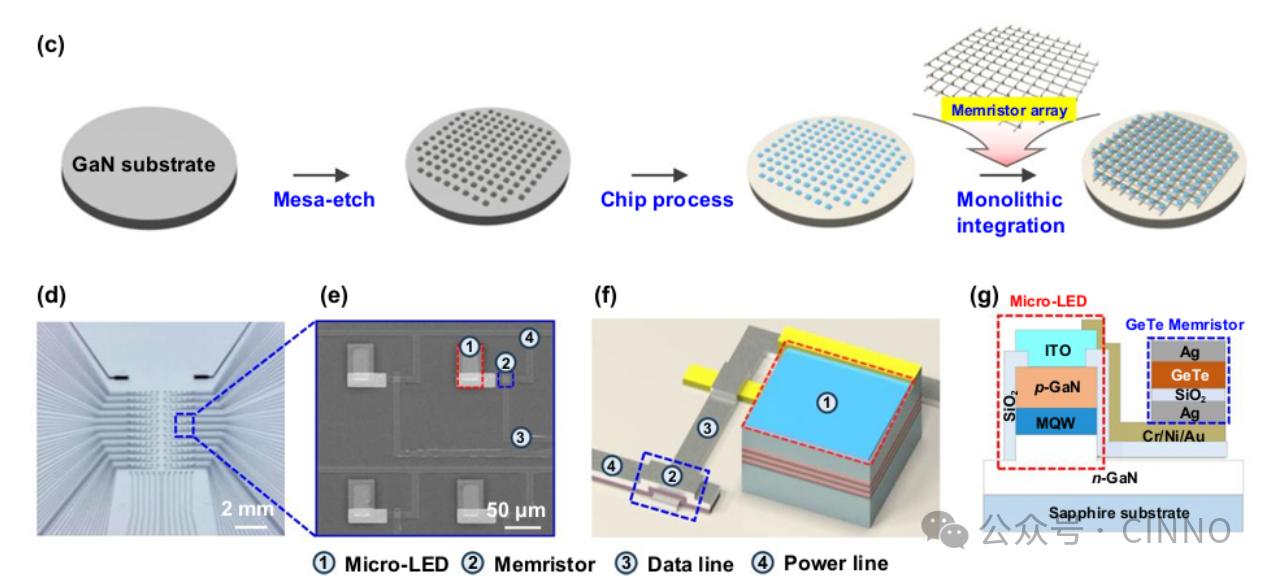 在制造工艺兼容性上,GeTe忆阻器更是展现出显著优势。与传统TFT需要300℃以上高温退火不同,GeTe忆阻器的制备可在室温下完成,且无需复杂的离子注入或掺杂工艺。研究团队采用 “台面刻蚀 - 钝化层沉积 - 忆阻器集成” 的单片工艺,仅需9道掩膜工序即可完成12×12 Micro-LED阵列的制备,较传统2T-1C架构减少4道关键工序,不仅降低了工艺复杂度,还避免了芯片转移过程中的机械损伤风险,良率提升至95%以上。