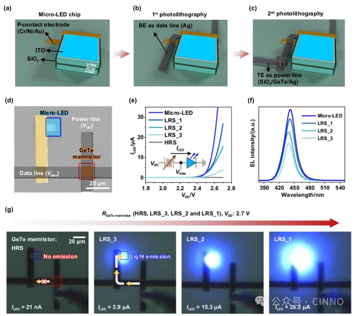 为满足显示场景对 “灰度级” 的需求,研究团队通过调控GeTe忆阻器的限流电流,成功实现了 “1个高阻态 + 3个低阻态” 的四档电阻调节,对应Micro-LED的 “熄灭” 与 “低、中、高” 三档亮度。测试结果显示,在2.7V的工作电压下,忆阻器处于高阻态(HRS)时,Micro-LED的驱动电流仅为21nA,几乎无发光;处于低阻态 LRS_1(176.3Ω)时,电流可达26.6μA,发光强度达到380nits;LRS_2(717.2Ω)与LRS_3(2.7kΩ)则分别对应15.3μA、3.93μA的电流与270nits、160nits的亮度,亮度分级清晰且稳定。
