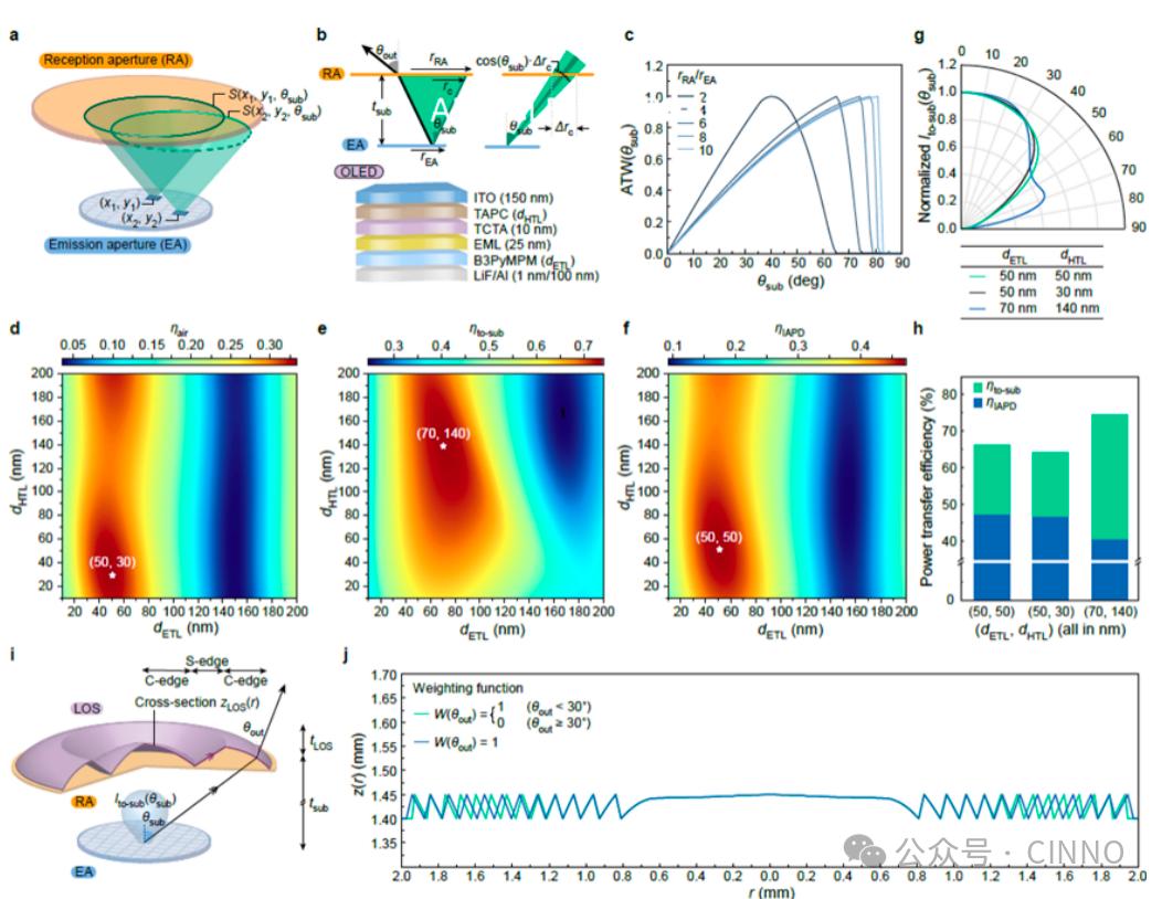 为了最大化ATW值,团队基于耦极子嵌入微腔模型,对OLED的电子传输层(ETL)和空穴传输层(HTL)的厚度进行了系统优化。通过大量的实验与模拟分析,研究人员发现,当电子传输层和空穴传输层的厚度均设定为50nm时,器件发射的光线会集中在 “低极角范围”(即靠近基板法线的方向)。这种光线分布特性能够让更多光线精准地指向RA,有效减少了光线在传输过程中的分散与损耗,使得 “发射孔径到接收孔径的功率传输效率(ηIAPD)”超过了47%。
