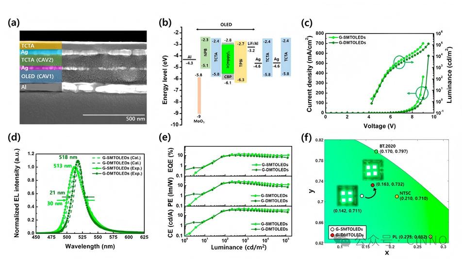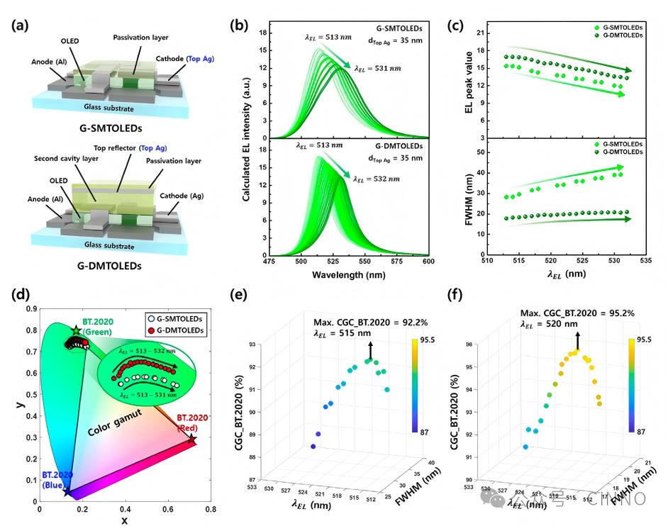图4. 绿色单微腔顶发射 OLED 与绿色双微腔顶发射 OLED 的性能对比:a) 器件结构示意图;b) 电致发光光谱对比;c) 峰值波长与半高全宽的变化规律;d) CIE 1931 色坐标与色域构建;e - f) 基于 BT.2020 标准的绿色色域表征
