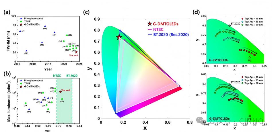 图6. 本研究开发器件与已报道的磷光和热活化延迟荧光发光层基绿色 OLED 器件的性能对比:a) 已报道器件的半高全宽汇总;b) 最大亮度与 CIEy 坐标的关联特性;c) G - DMTOLED 的 BT.2020 色域构建;d) 顶银层厚度对色坐标的影响