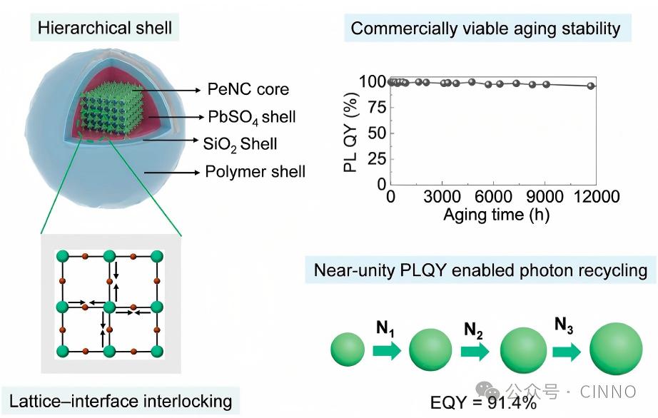 此外,研究团队还通过系统实验证实,二价铅盐壳层是形成互锁界面层的关键,其中PbSO₄的稳定效果最优;而外层APTES-SiO₂-硅氧烷层则是实现完全晶格 - 界面锁定的必要条件,缺少任何一层都会导致稳定性大幅下降。这种 “锁晶格 + 稳表面” 的双重作用,打破了钙钛矿纳米晶体的降解循环,为其实现高量子产率与长寿命提供了核心保障。