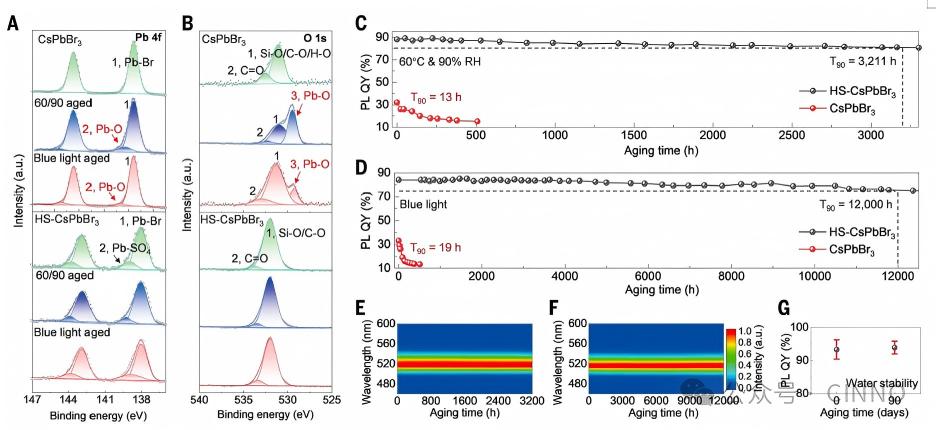 水环境稳定性:HS-CsPbBr₃薄膜在水中浸泡 90 天后,仍能保持近乎恒定的光致发光量子产率,展现出优异的防水性能,彻底改变了钙钛矿材料遇水易降解的固有缺陷;