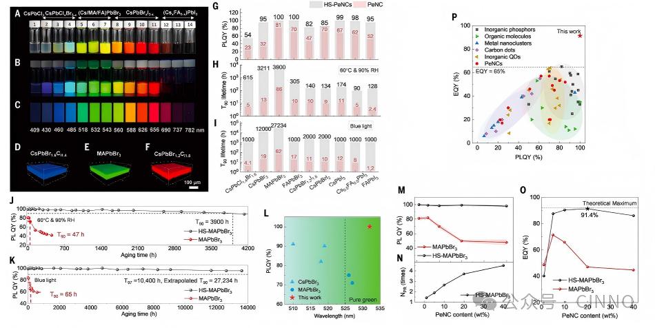 有机 - 无机杂化体系:HS-MAPbBr₃、HS-FAPbBr₃等杂化体系均实现了高量子产率与长寿命的统一,其中 HS-MAPbBr₃的纯绿光发射(525-535 nm)完全符合 BT.2020 标准,性能超越商用 CdSe-ZnS 量子点;