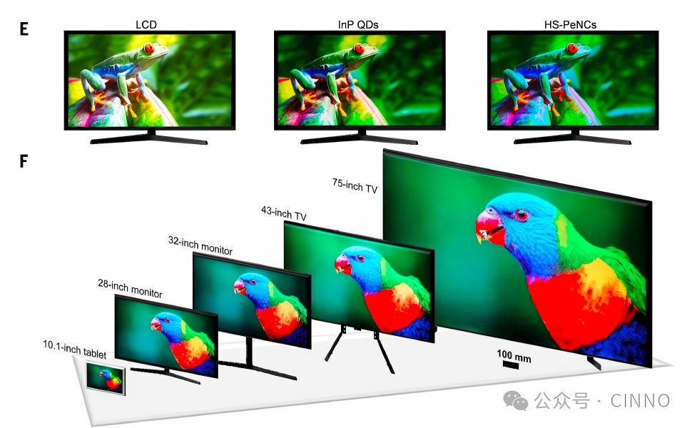研究团队已成功演示了基于 HS - 钙钛矿纳米晶体的全系列显示原型器件,包括 4K 超高清显示面板(3840×2160 像素)、10.1 英寸平板电脑、28 英寸和 32 英寸专业显示器,以及 43 英寸和 75 英寸超大尺寸电视。这些器件的色域覆盖达到 Rec. 2020 标准的 97% 以上、NTSC 标准的 131% 和 sRGB 标准的 185%,远超现有液晶显示器(LCD)、磷化铟(InP)量子点显示器和有机发光二极管(OLED)显示器的色域表现,呈现出更逼真、更鲜艳的色彩效果。