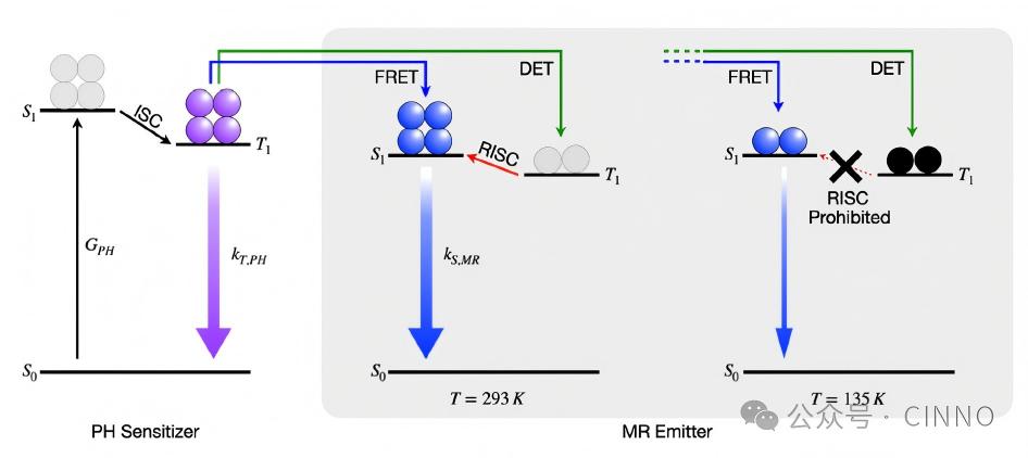 在PSF架构中,磷光敏化剂的三线态激子可通过两种路径转移至MR发射器:福斯特共振能量转移(FRET)和德克斯特能量转移(DET)。这两种路径的竞争关系,是影响三线态积累的关键因素。