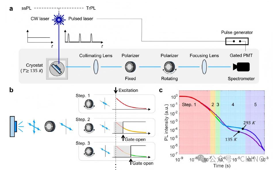 图4. a) 变温条件下稳态光致发光与瞬态光致发光测量的实验装置;b) 利用两片线性偏振片和门控光电倍增管实现高信噪比瞬态光致发光的多脉冲数据拼接方法;c) 于293 K和135 K下测得的高信噪比瞬态光致发光曲线